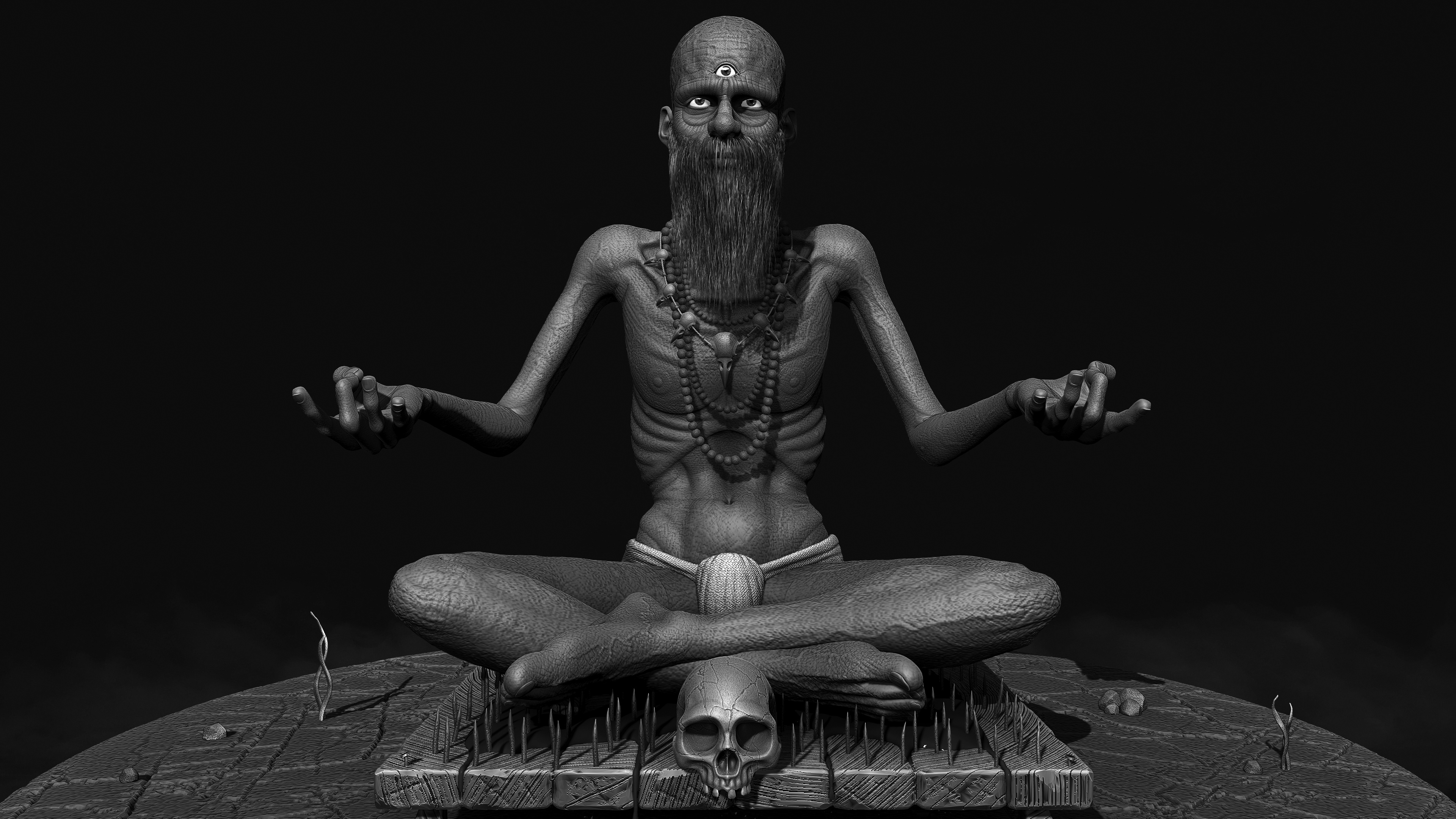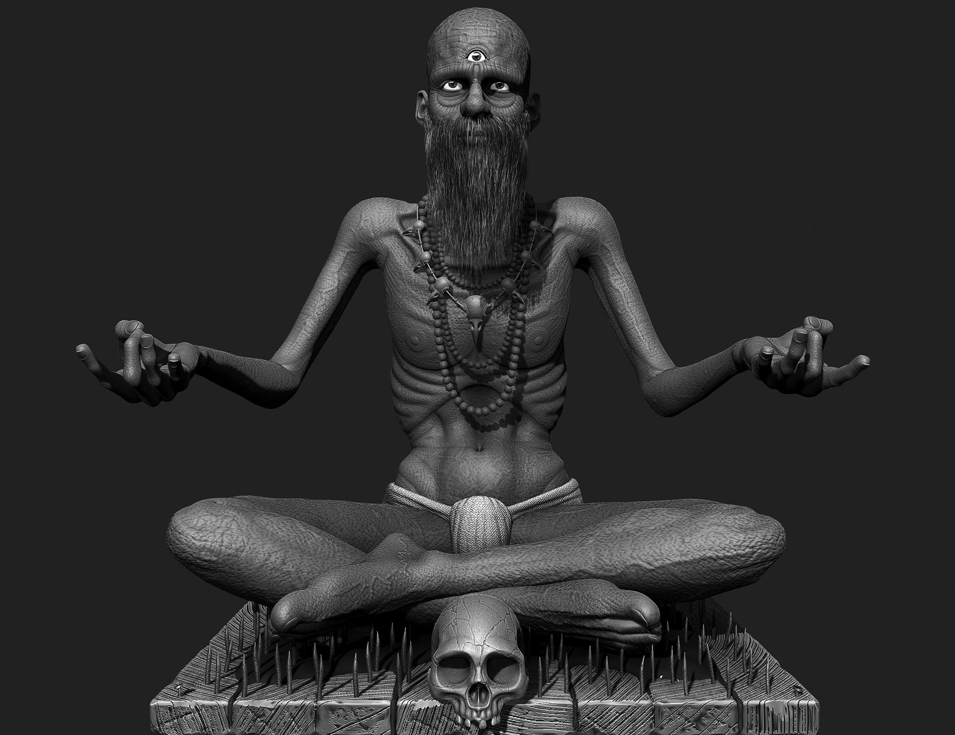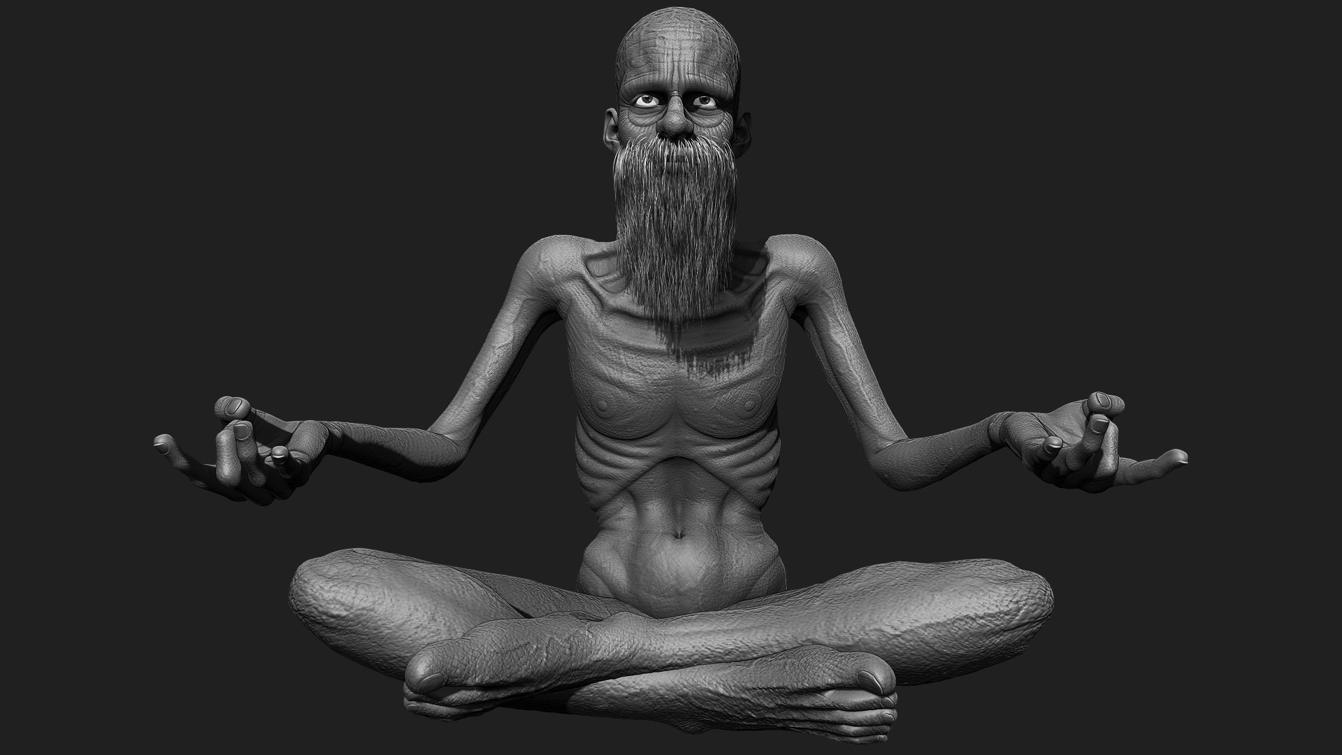 I started with this well fed chap seated in lotus pose, then basically turned him into the lorax with requisite shaman beard. Was thinking at first he was to be an aghori sadhu of northern India, covered in human corpse ash. Spent a week or two down that rabbit hole, and it's well worth a google, I promise you.