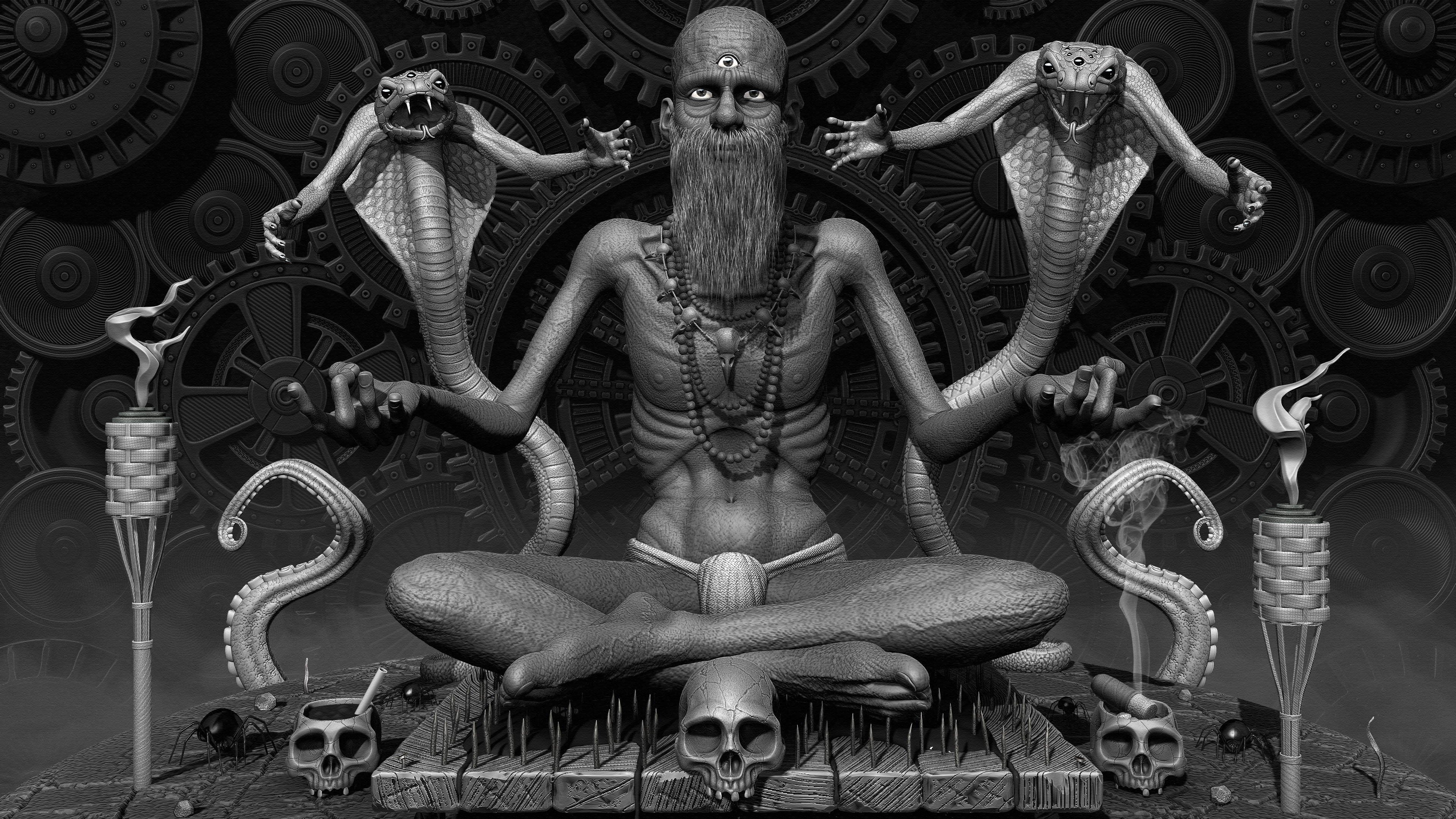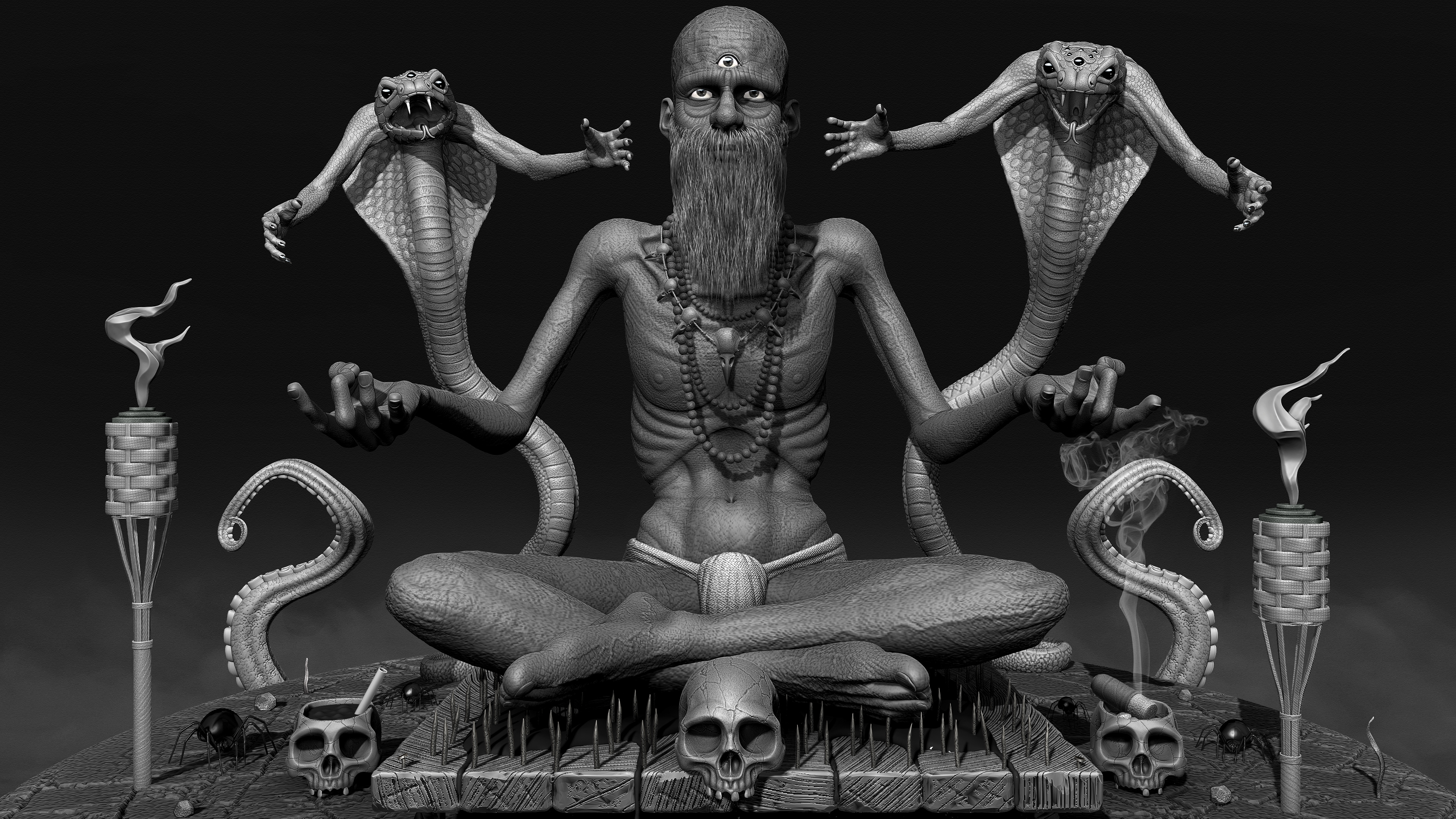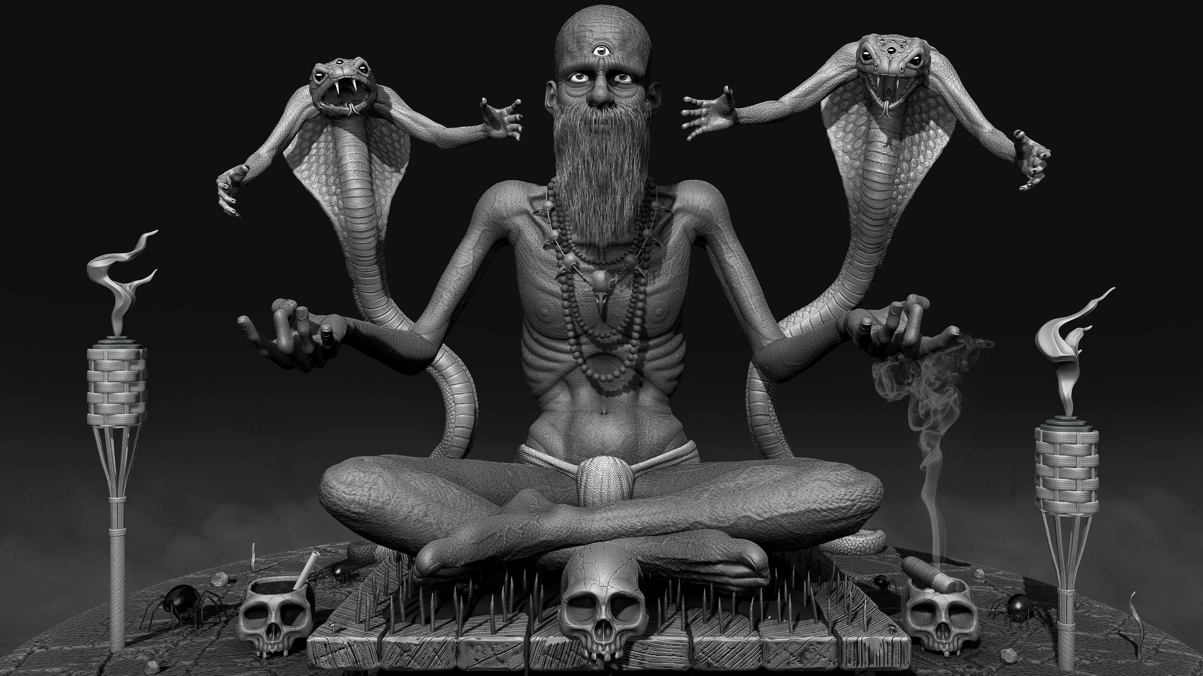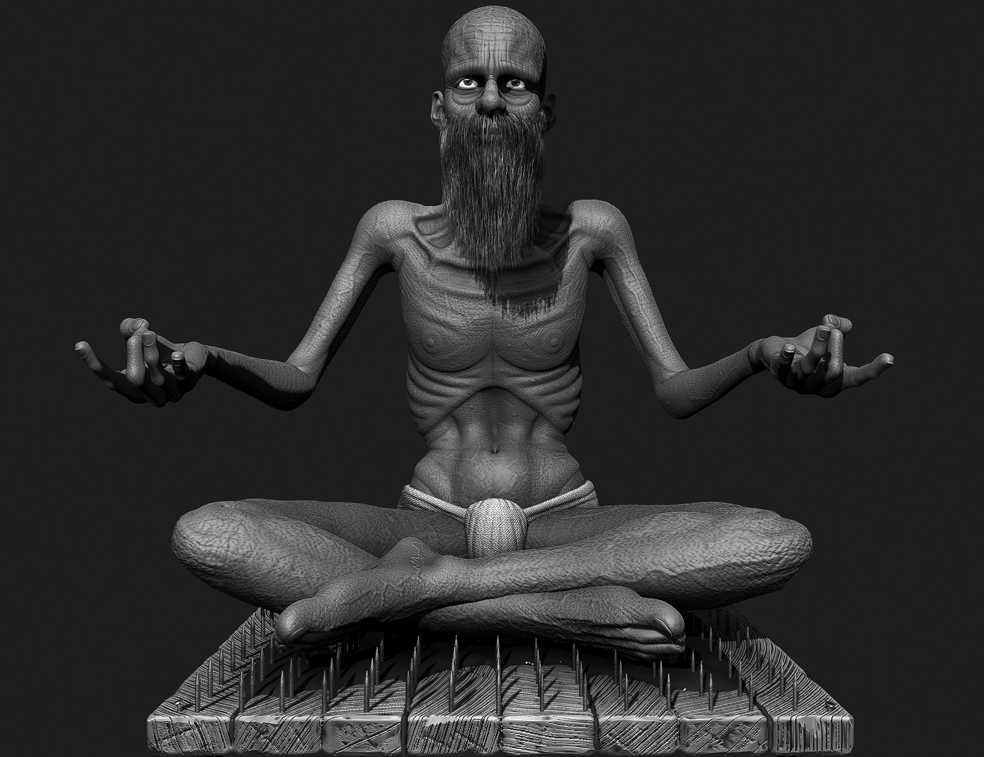 I started with this well fed chap seated in lotus pose, then basically turned him into the lorax with requisite shaman beard. Was thinking at first he was to be an aghori sadhu of northern India, covered in human corpse ash. Spent a week or two down that rabbit hole, and it's well worth a google, I promise you.