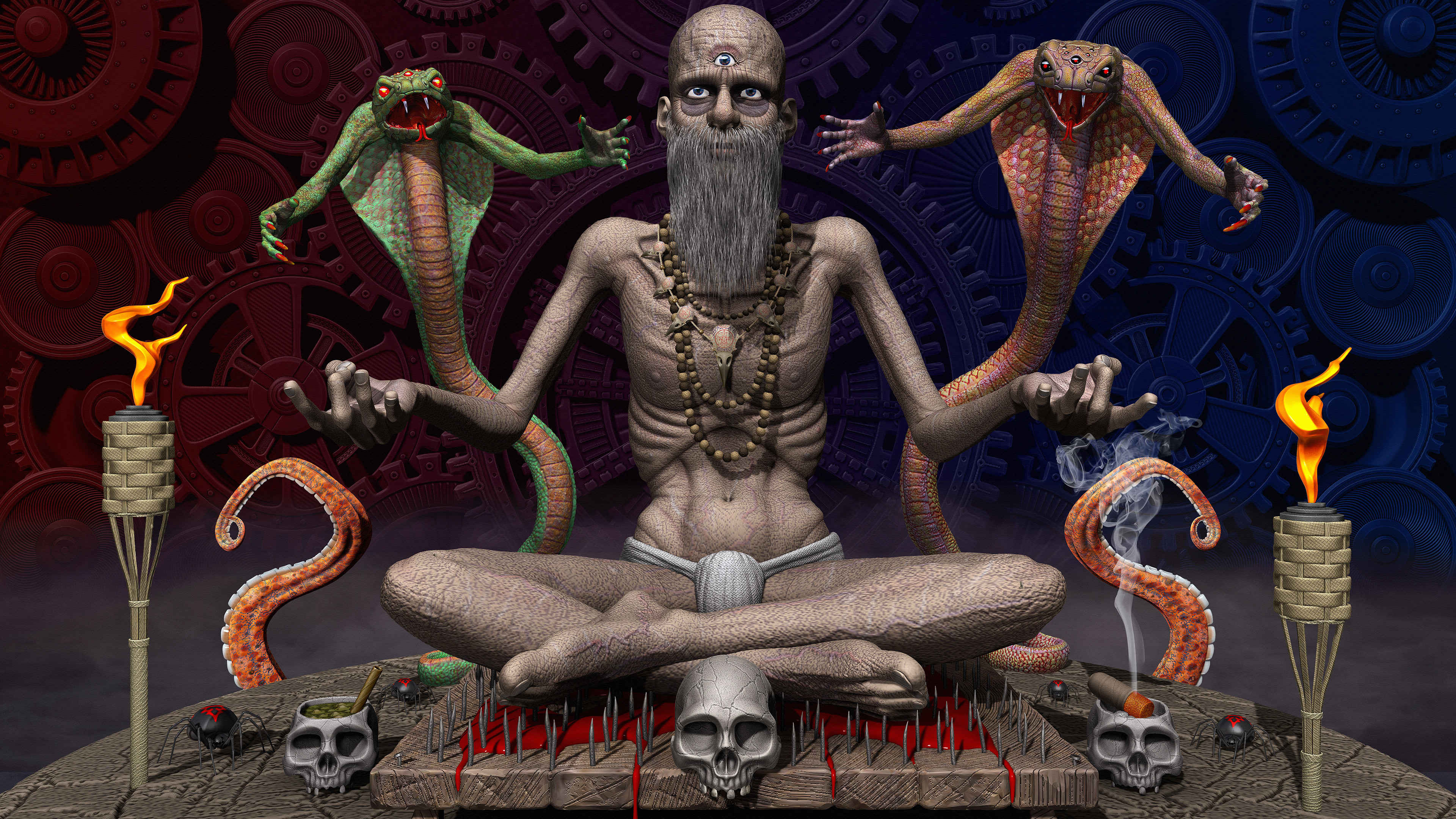 Now you're asking yourself, if this indeed is a snake oil shaman, why is he willingly self-mutilating? And what's with the third eye and monsters, huh? How is this not on the level?